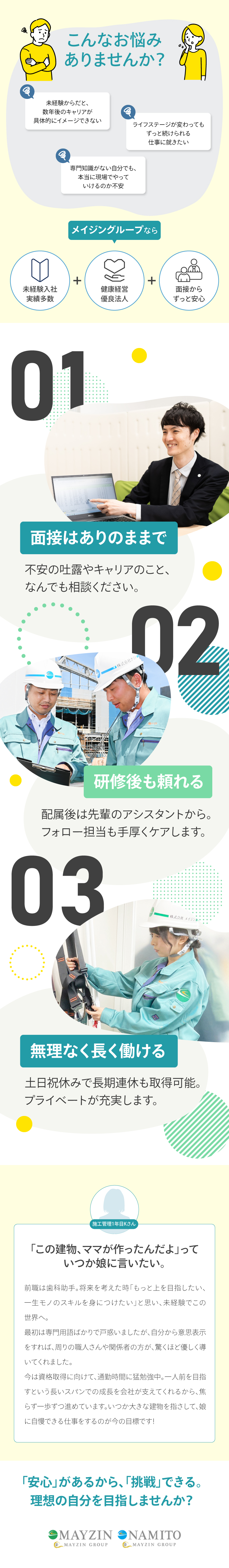 未経験・知識ゼロからのスタートでしたが、アシスタントとして先輩のサポート業務から始められたので安心でした。分からないことはすぐ聞ける温かい環境で、着実に成長中。メイジンを選んで本当に良かったです!
