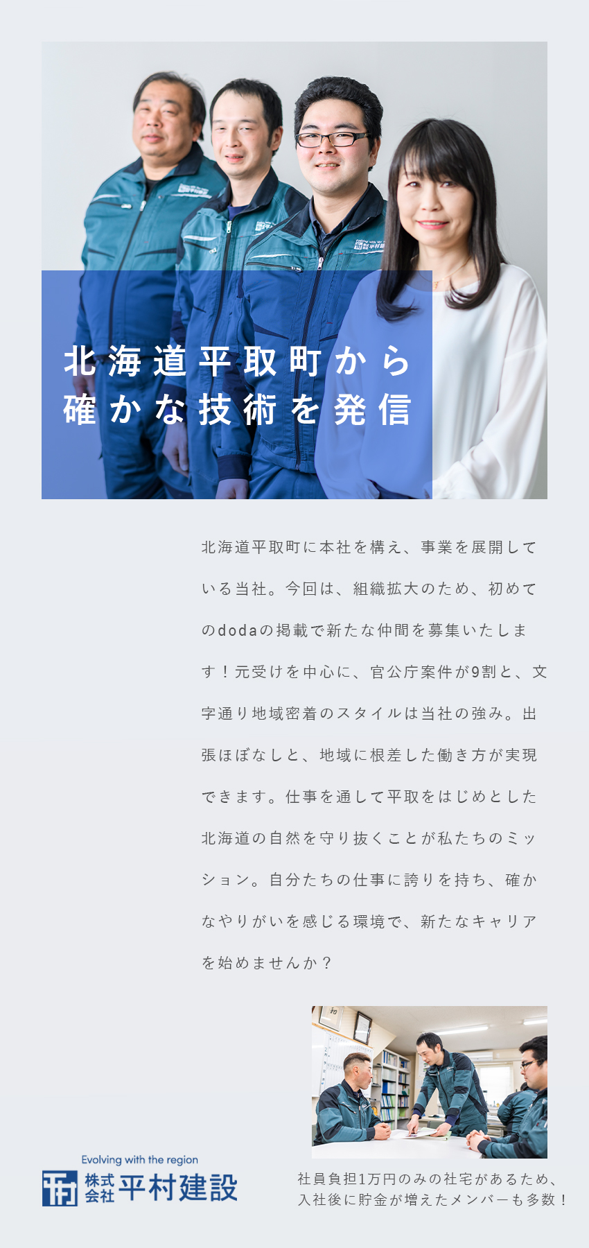 【北海道/平取町】建設技術者(経験者) ※残業月平均20~30時間程度/社宅完備/研修制度充実