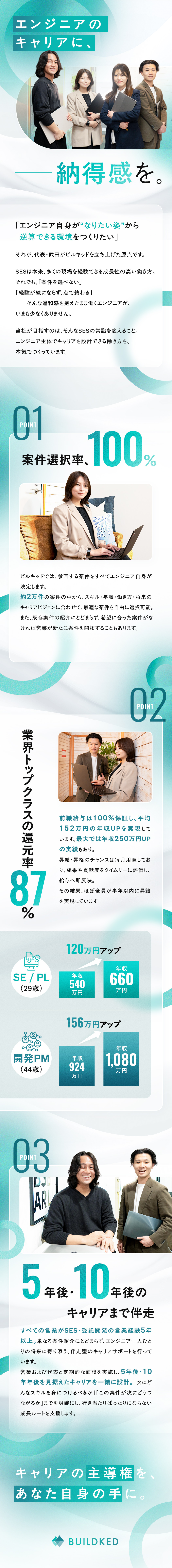 代表が定例面談を行い、営業の評価軸にもキャリア実現度を組み込んでいます。エンジニアファーストが言葉だけで終わらないよう、仕組みとして支えながら、前向きに成長できるキャリア形成をサポートしています。