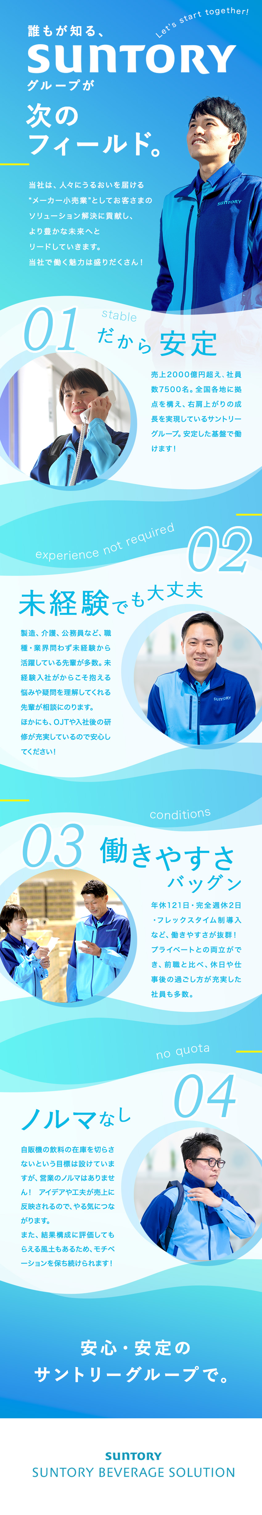 人々にうるおいを届ける”メーカー小売業”として、飲料を通じて、心とからだの潤い、健やかな暮らしをお届けする仕事。これはサントリービバレッジソリューションで活躍する、ルートセールスならではのやりがいです。