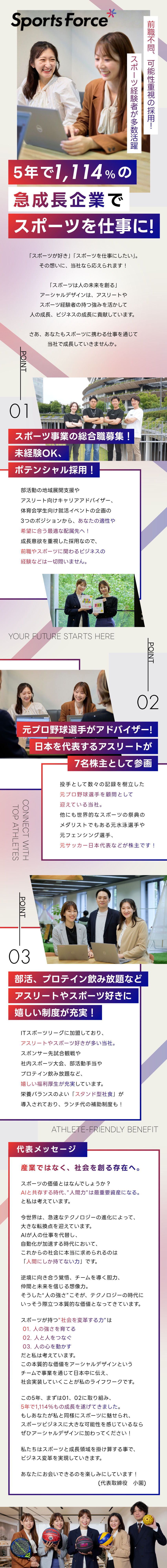 スポーツの力を使って、産業の成?を促進し、社会をアップデートするプラットフォーム「SportsForce」を展開しているます。スポーツが持つ価値を分野横断的に社会へと実装するという、大きなやりがいを感じられます。