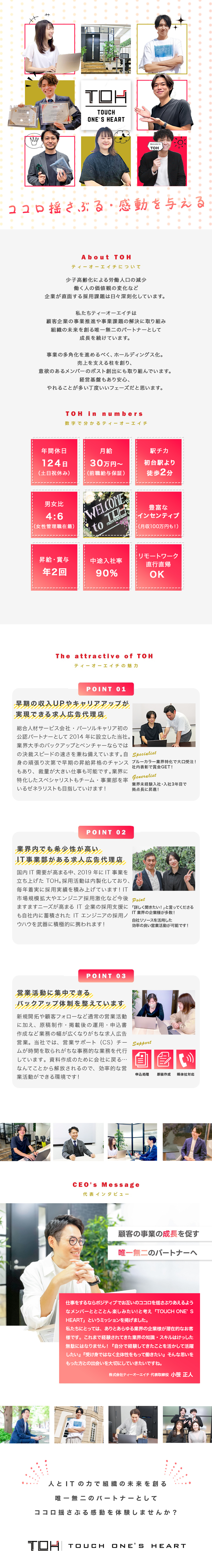 2014年にパーソルキャリア初の「公認パートナー」として事業をスタートした株式会社ティーオーエイチ。2019年にはIT事業部を設立し、「人材」と「IT」の二軸で事業拡大を続けてきました。同社の成長の背景には、同社が掲げるMVVのもと、1人ひとりが主体性をもって業務に取り組んでいるからだと同社代表の小笹社長は語ります。