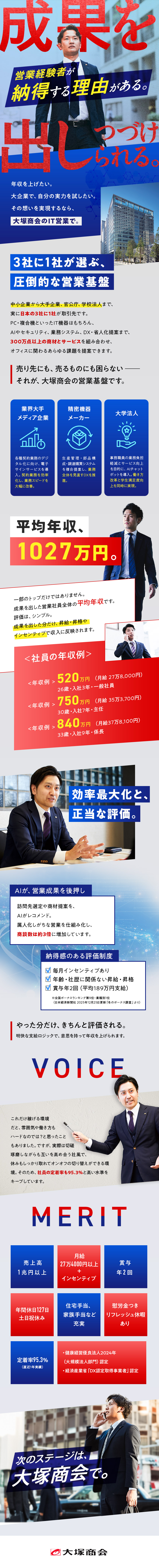 実際、大塚商会の営業職の平均年収は1027万円と高水準ですが、直近1年の定着率は95.3%。この数字は、無理なく成果を出せる環境が整っていることの表れです。