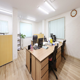白い壁と木目調のフローリングで明るく開放的な事務所です!