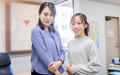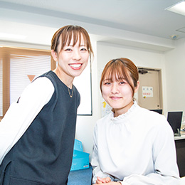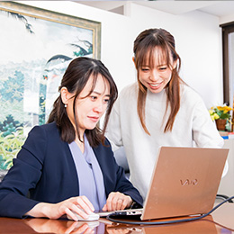 私たちは店舗の売上や経費のデータ入力を行っています。先輩と同じ業務を分担しながら、チームで効率よく仕事を進めています。分からないことを隣にいる先輩に質問しながら、落ち着いた雰囲気のなか働いていますね。