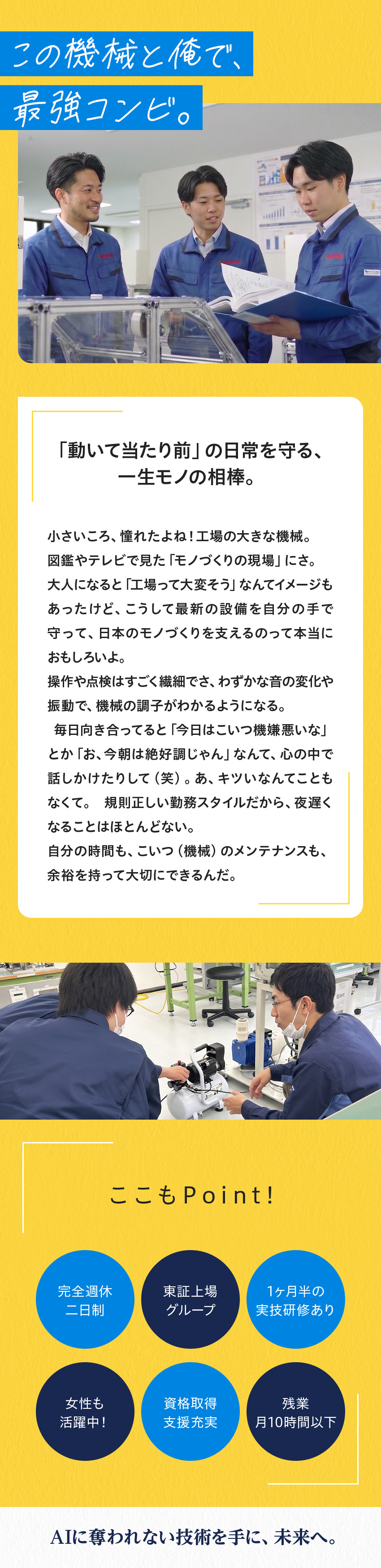「機械が正常に動く」という当たり前の日常を守る、唯一無二のプロを目指せます 。AI化が進む中でも、現場で機械に触れ、音や匂いの異変を察知して修理できるのは「人」だけです 。トラブルを自分の手で解決した際の達成感は大きく、お客様から「助かったよ」と直接感謝される機会も多くあります 。一生モノの技術を手にし、製造現場のヒーローとして頼られる喜びを実感できるはずです 。
