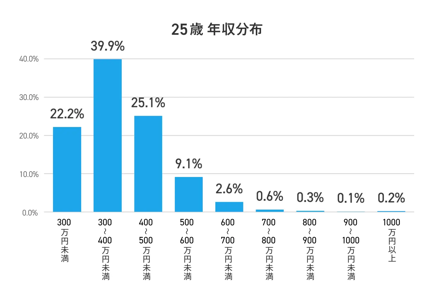 25歳の年収分布を見ると、最も割合の高い年収帯は「300~400万円未満」で39.9%、次いで「400~500万円未満」が25.1%、「300万円未満」が22.2%となっています。
