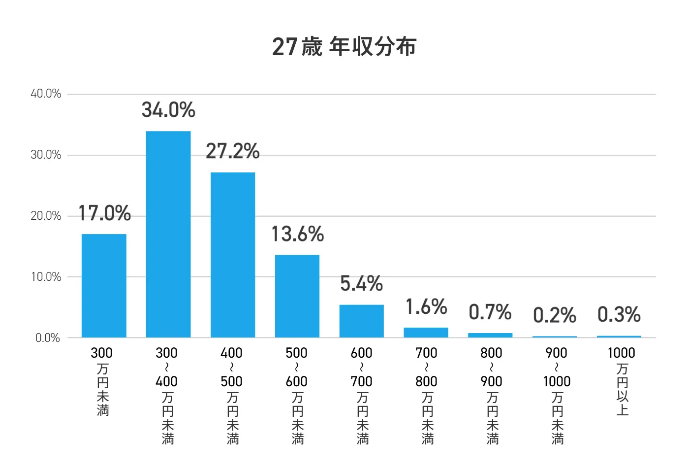 27歳の年収分布を見ると、最も割合の高い年収帯は「300~400万円未満」で34.0%、次いで「400~500万円未満」が27.2%、「300万円未満」が17.0%となっています。