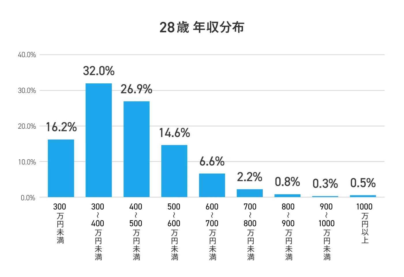 28歳の年収分布を見ると、最も割合の高い年収帯は「300~400万円未満」で32.0%、次いで「400~500万円未満」が26.9%、「300万円未満」が16.2%となっています。