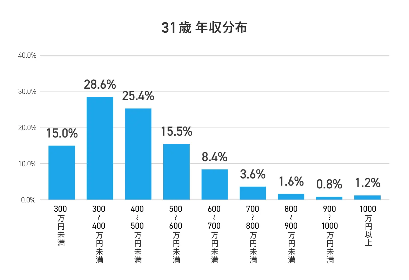 31歳の年収分布を見ると、最も割合の高い年収帯は「300~400万円未満」で28.6%、次いで「400~500万円未満」が25.4%、「500~600万円未満」が15.5%となっています。