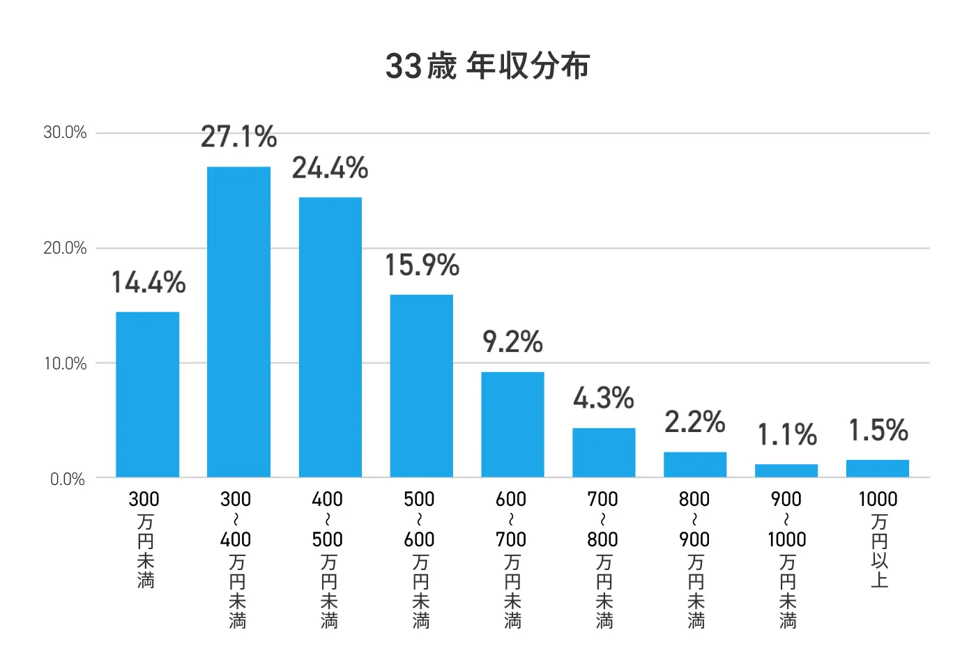 33歳の年収分布を見ると、最も割合の高い年収帯は「300~400万円未満」で27.1%、次いで「400~500万円未満」が24.4%、「500~600万円未満」が15.9%となっています。