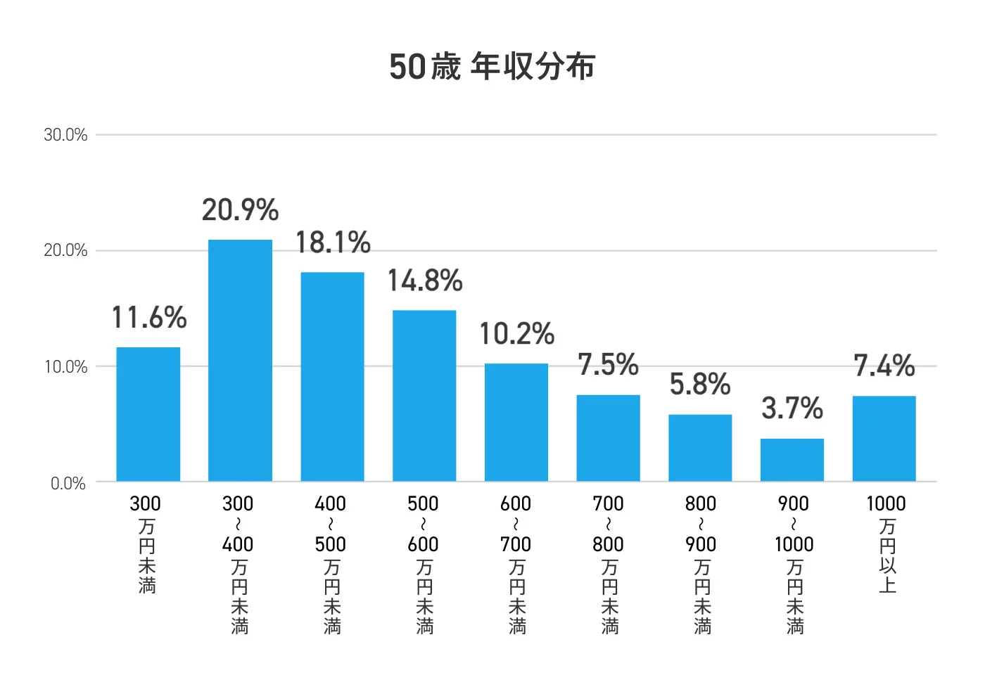 50歳の年収分布を見ると、最も割合の高い年収帯は「300~400万円未満」で20.9%、次いで「400~500万円未満」が18.1%、「500~600万円未満」が14.8%となっています。
