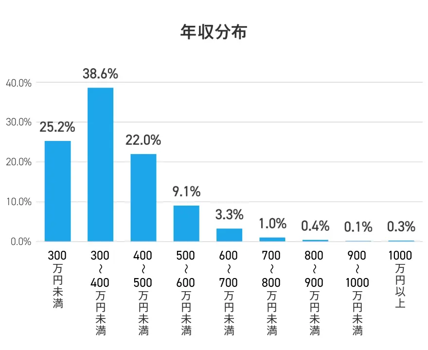 20代の年収分布を見ると、最も割合の高い年収帯は「300万~400万円未満」で38.6%、「300万円未満」が25.2%、「400万~500万円未満」が22.0%となっており、この3つの年収帯(500万円未満)に85.8%の人が含まれています。20代で「1,000万円以上」の年収帯の人の割合は0.3%でした。