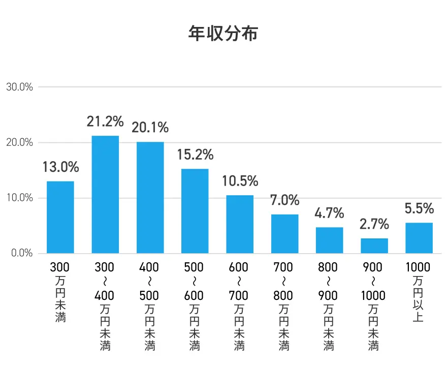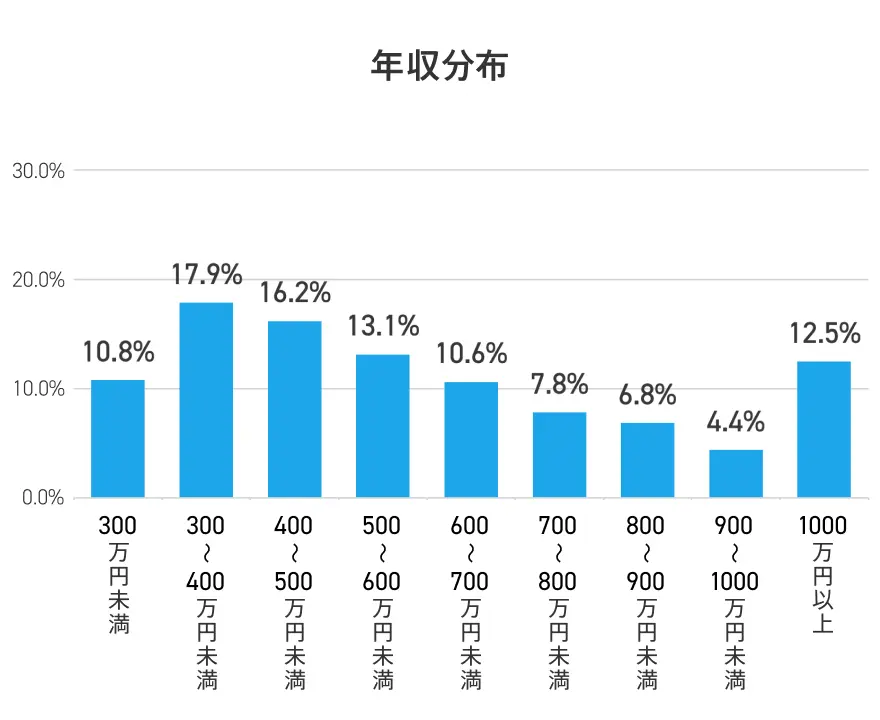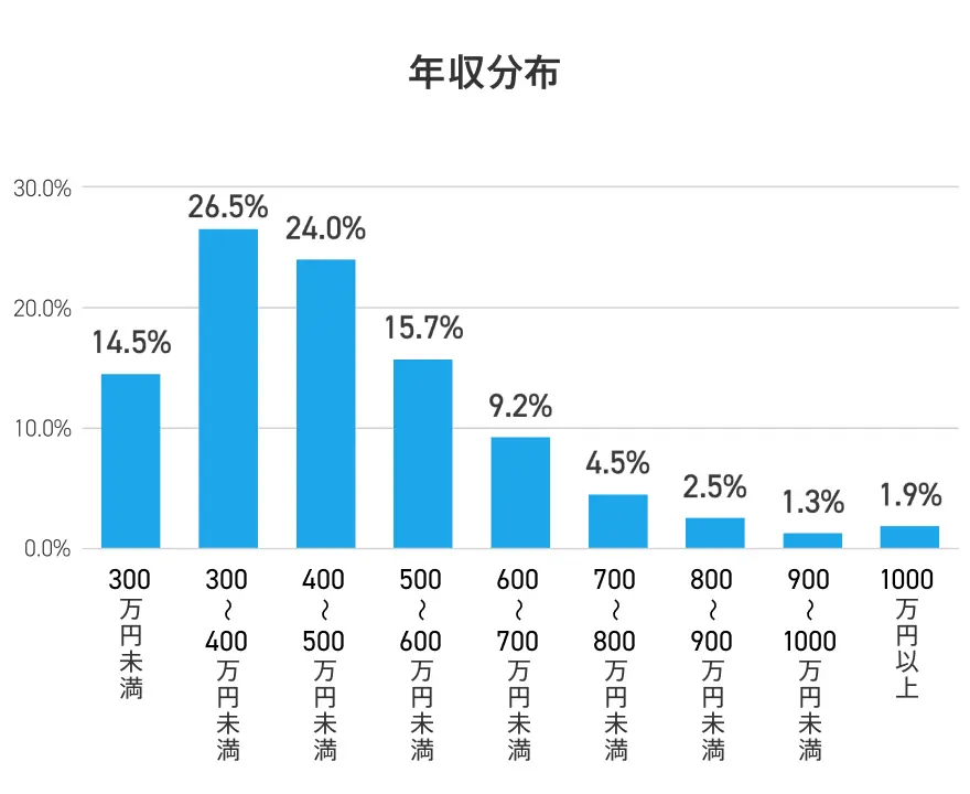 年収分布の中で最も割合の高い年収帯は「300万~400万円未満」で31.3%、次いで「400万~500万円未満」が21.8%、「300万円未満」が19.6%となっており、この3つの年収帯(500万円未満)に72.6%の人が含まれています※。「1,000万円以上」の年収帯の人の割合は2.4%で、前年の割合から変化はありませんでした。